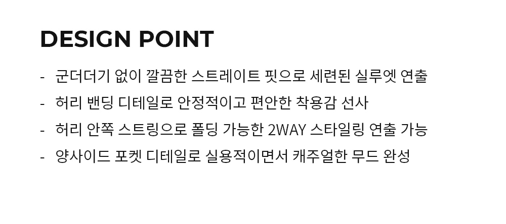 【設計重點】 直筒版型設計,俐落無多餘線條,展現精緻剪裁輪廓 腰部鬆緊帶細節,穿著穩定且舒適 腰間內側抽繩設計,方便調整,實現2WAY造型 兩側口袋設計,兼具實用性與休閒風格 【乾爽抽繩褲】 具優異耐穿性及柔軟穿感的抽繩褲面料 【布料特點】 柔軟舒適,適合穿著的純棉混紡抽繩褲面料 添加聚酯纖維,彈性適中且回彈性佳 FABRIC INFO Cotton 75% Polyester 25%