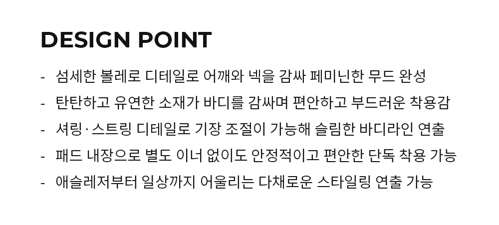 DESIGN POINT - 環繞肩部和頸部的精緻短上衣細節完美展現了女性氣質。 - 堅固而靈活的材質包覆身體,提供舒適柔軟的貼合感。 - 褶皺和繩子細節可調整長度,打造纖細的身體線條。 - 內置墊可實現穩定、舒適的一次性佩戴,無需單獨的內層 - 有多種款式可供選擇,從運動休閒到日常穿著。 FABRIC POINT - 外表面採用淺桃皮處理,質感柔軟,穿著舒適 - 類似天然棉質材質,帶來自然舒適的觸感 - 氨綸混紡布料四向拉伸,運動自由舒適 - 採用聚酯纖維材質製成,輕盈透氣,讓您保持涼爽 FABRIC INFO Polyester 92% Polyurethan 8%