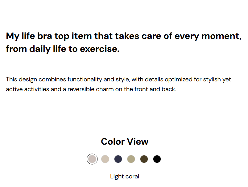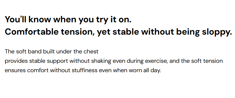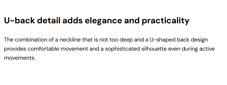Product Description: 胸下配有柔軟彈性帶,能穩定支撐不晃動。 彈力適中,適合全天候穿著。 適中的領口深度搭配 U 型美背 設計。 正面下方的 褶皺 (Dart) 細節 營造出立體感與自然豐盈的視覺效果。 Fabric Info: 手感柔軟,紋理細密均勻。 耐磨損、抗汗水,持久耐穿。 採用高密度細纖維編織,輕盈且結構紮實。 具有優異的吸濕排汗功能,保持乾爽舒適。