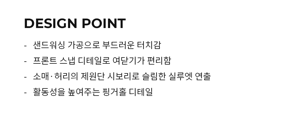 DESIGN POINT - 砂洗工藝帶來柔軟觸感 - 正面按扣設計,方便開合 - 袖子和腰部的羅紋下擺營造出纖細的輪廓 - 手指孔細節可提高靈活性 FABRIC POINT - 採用環保再生材料加工的布料 - 採用四向氨綸布料,非常適合各種活動 - 優質布料,經過砂磨處理,手感柔軟 - 運動後吸收汗水並快速乾燥 - 耐用,因此您可以長時間佩戴而不會失去其原始形狀。 FABRIC INFO Modal38%, Polyester53%, Span9%