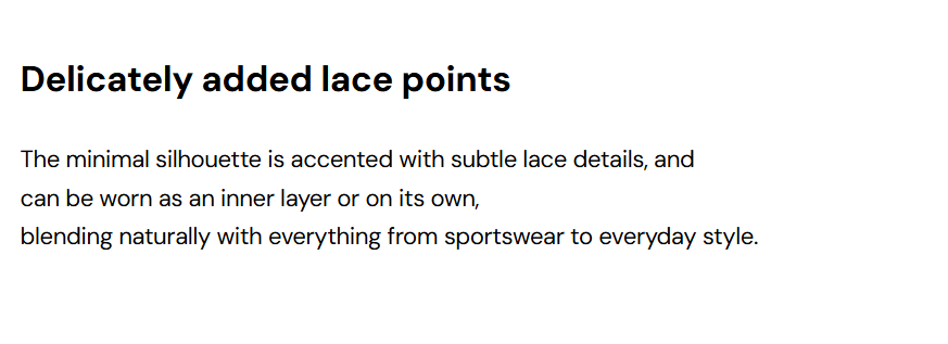 Product Description: 精緻的蕾絲與波浪形(W-shaped)細節,勾勒出優雅的輪廓。 配有細肩帶與內置襯墊,提供輕盈舒適的穿著體驗。 適合多種風格,不論是搭配運動裝或日常休閒服飾都能自然融合。 Fabric Info: 具有均勻且密集的顆粒紋理,手感柔軟。 具備強韌的耐用性,能有效抵抗汗水與摩擦。 由細纖維密集編織而成,質地輕盈但結構結實。 布料舒適,擁有優異的吸水與透氣釋放性能。