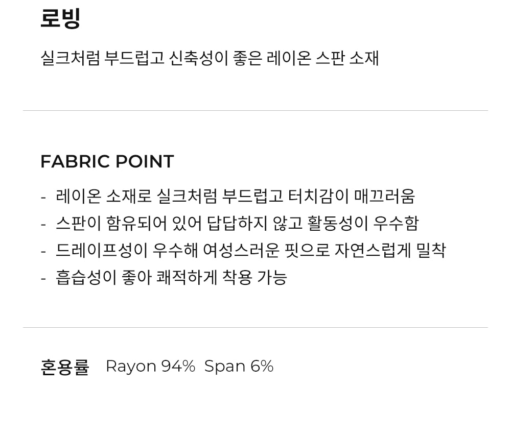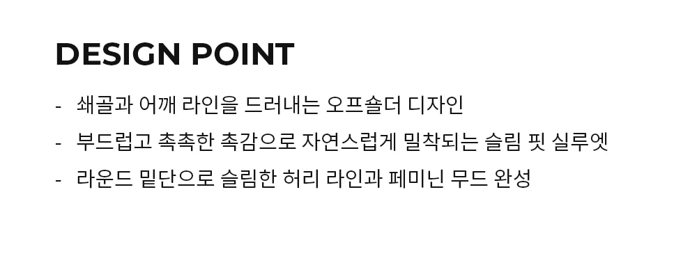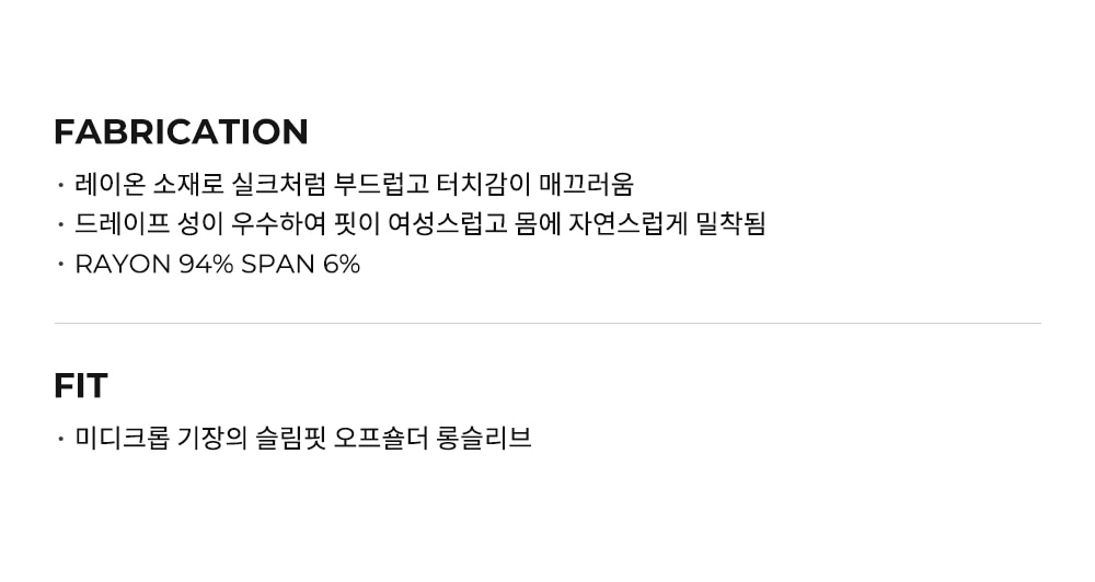 大方露出鎖骨與肩膀線條的 Off-shoulder 剪裁 觸感柔軟滋潤,能自然貼合身型的 Slim Fit 纖細輪廓。 精緻的圓弧下擺設計,視覺上更顯腰部纖細 FABRIC INFO 94% Rayon 6% Span