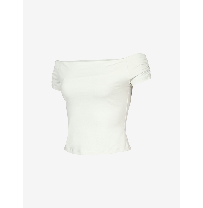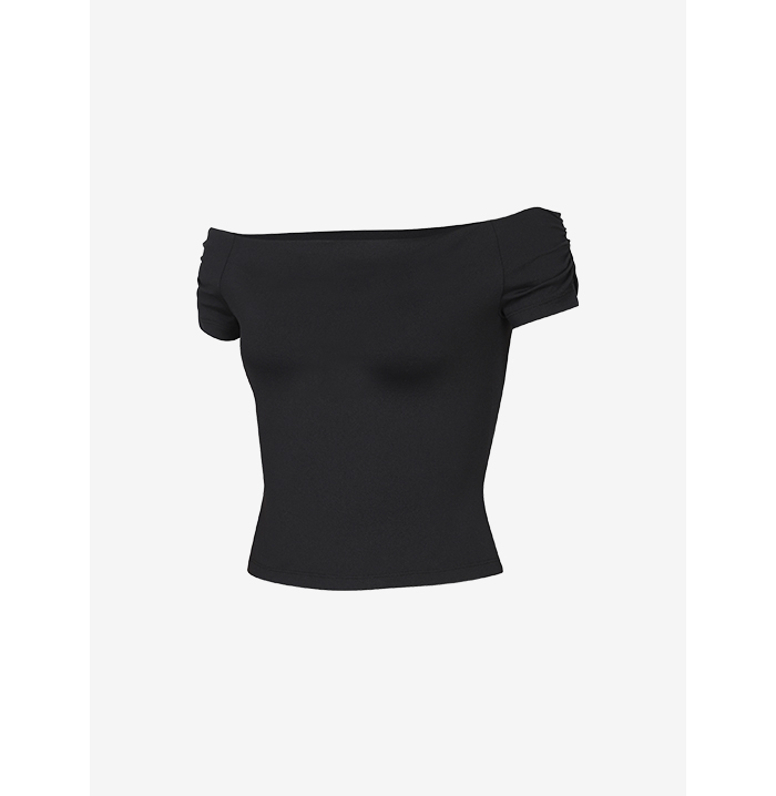 露肩短版剪裁, 展現鎖骨與肩線的平口露肩設計,搭配俐落的短版剪裁。 肩部皺皺設計, 透過肩膀處的皺皺細節,溫柔包覆手臂,同時提供穩定的穿著感。 貼合身型曲線, 柔軟貼身的材質與剪裁,勾勒出纖細修長的身體線條。 領口與肩帶張力支撐: 領口與肩部線條具有彈性張力,確保衣物服貼不走光 Nylon 91% Polyurethane 9%