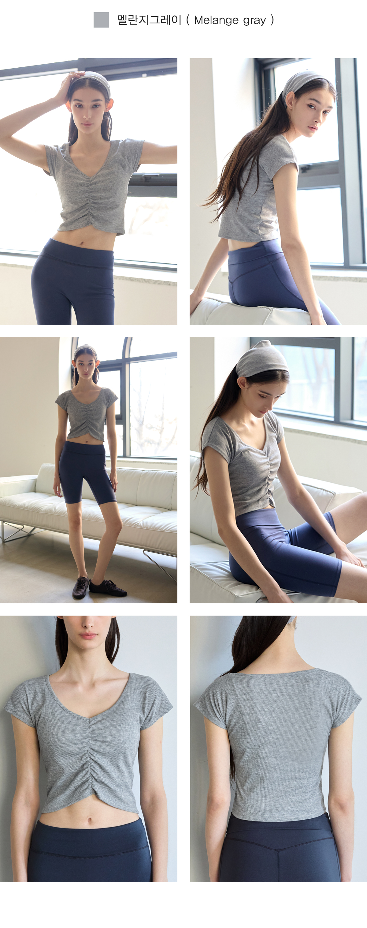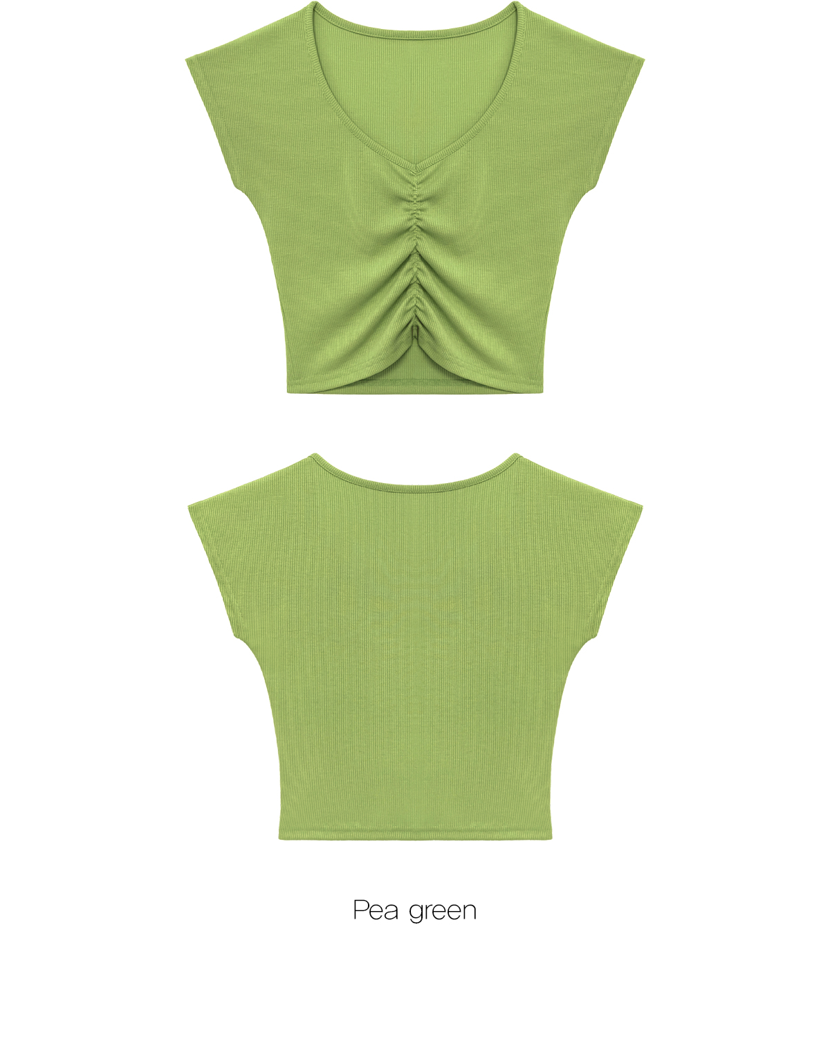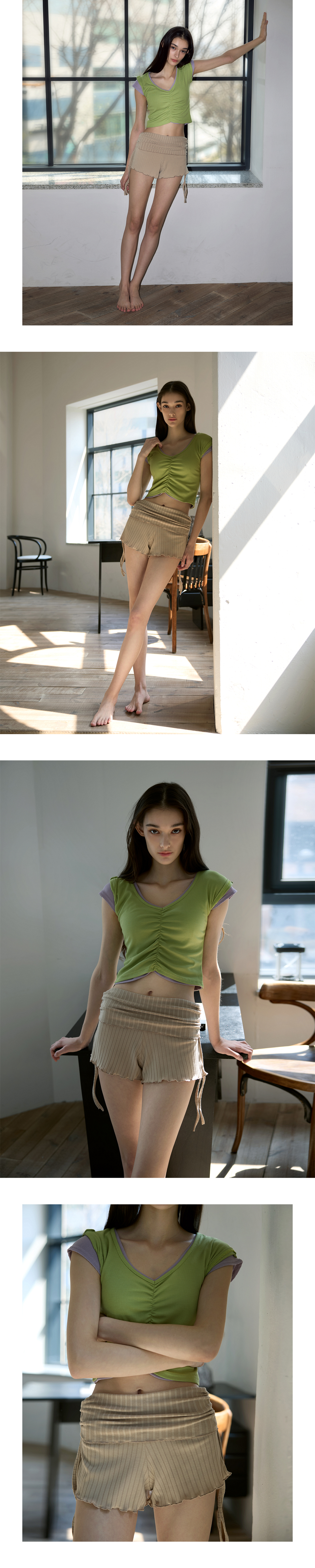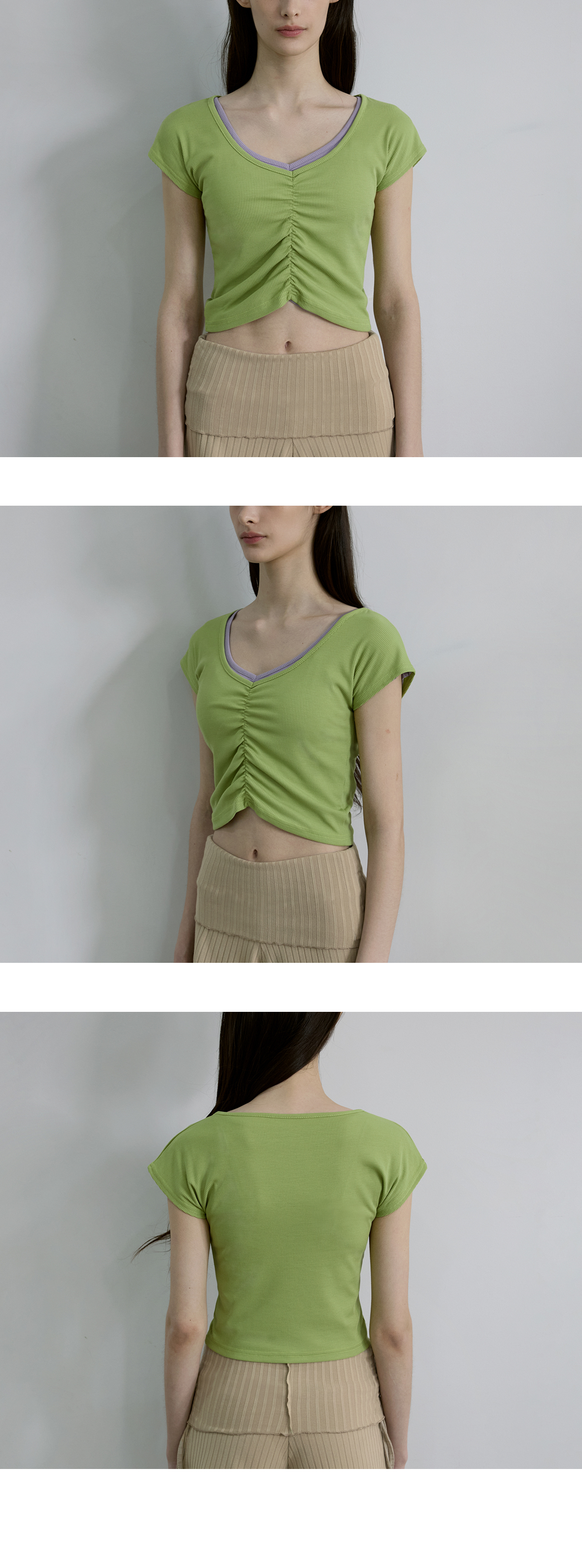 Shirring設計,搭配寬 V 領線條,能有效修飾頸部線條,營造柔美氛圍。 Semi-Crop(半短版) 長度,視覺上能拉長腿部比例。 使用日常感十足的羅紋 (Ribbed) 布料,彈性佳且透氣,無論是運動還是日常穿搭都很合適。