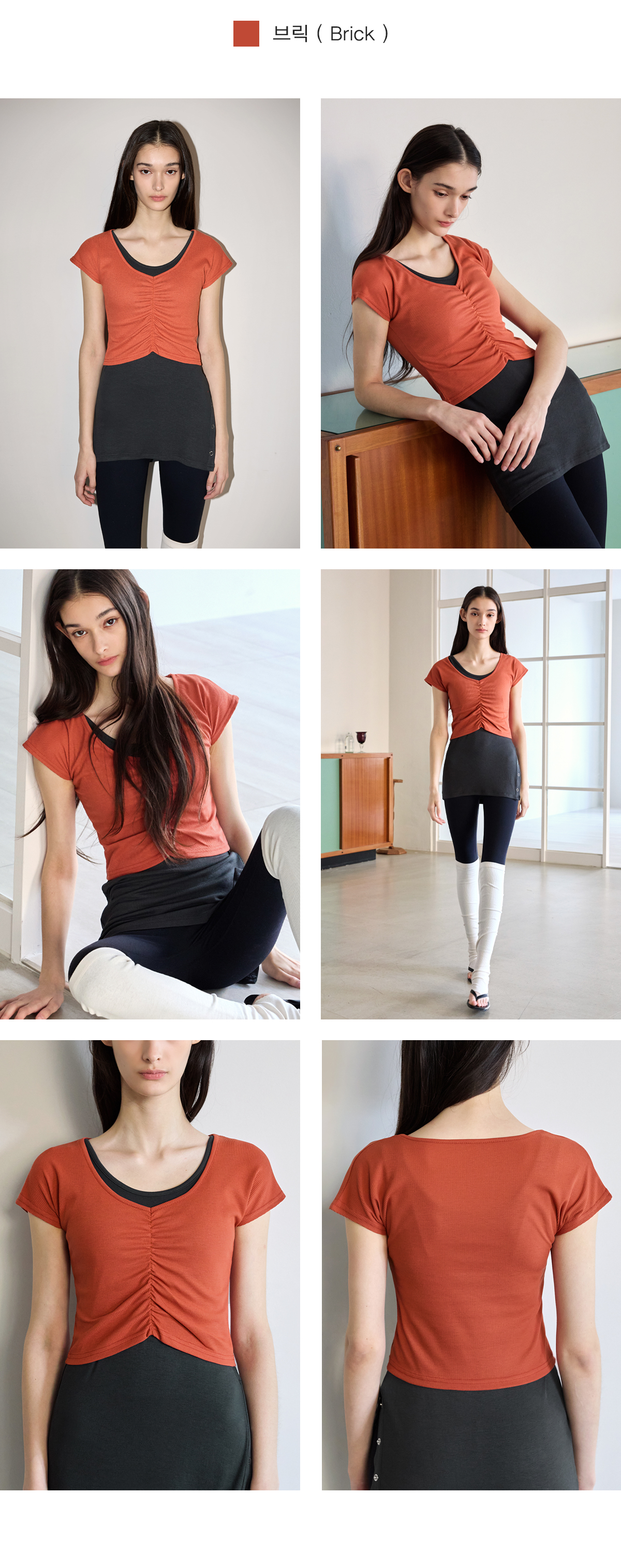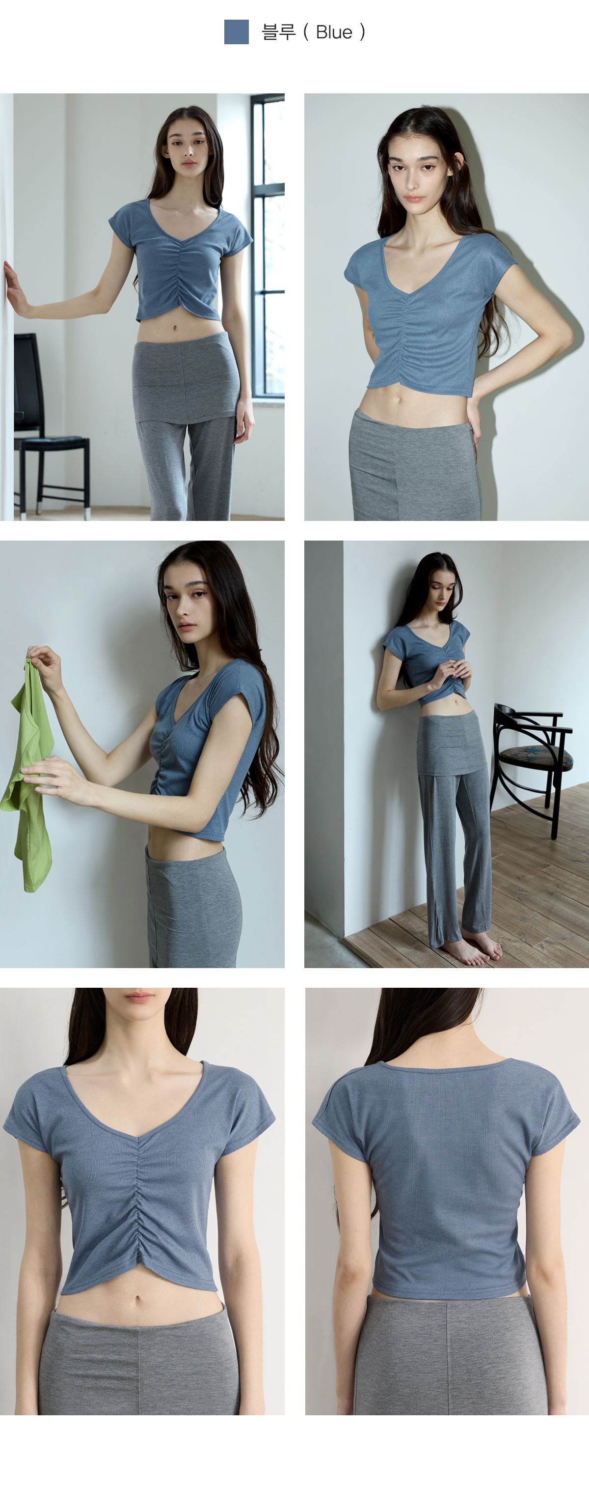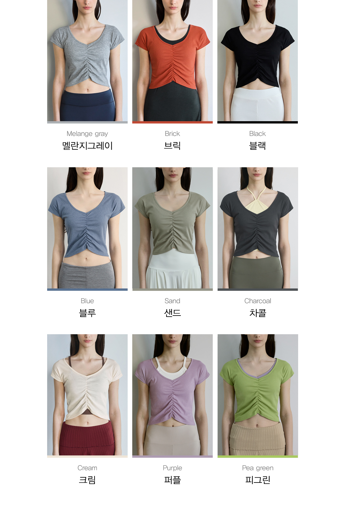 Shirring設計,搭配寬 V 領線條,能有效修飾頸部線條,營造柔美氛圍。 Semi-Crop(半短版) 長度,視覺上能拉長腿部比例。 使用日常感十足的羅紋 (Ribbed) 布料,彈性佳且透氣,無論是運動還是日常穿搭都很合適。