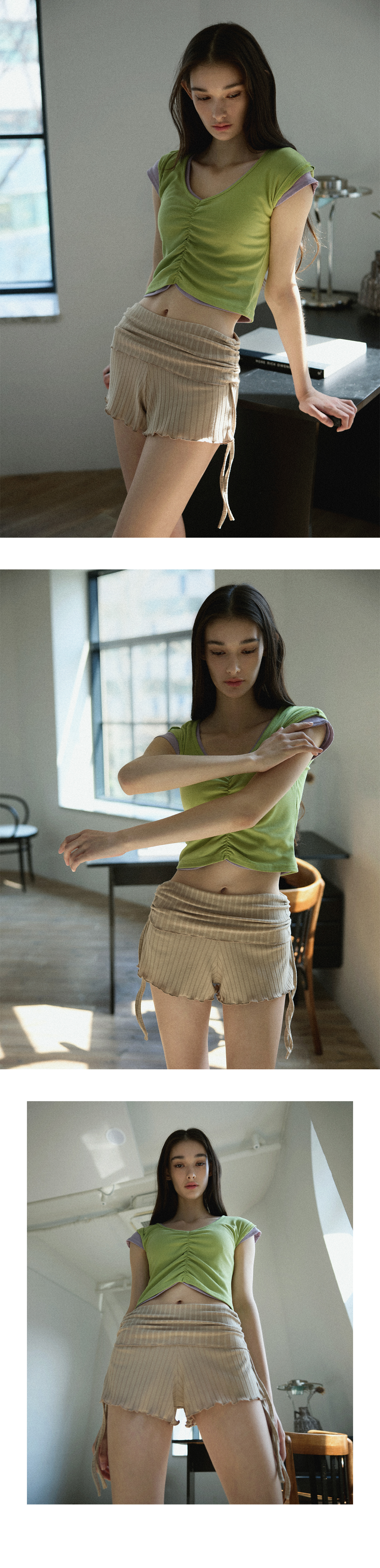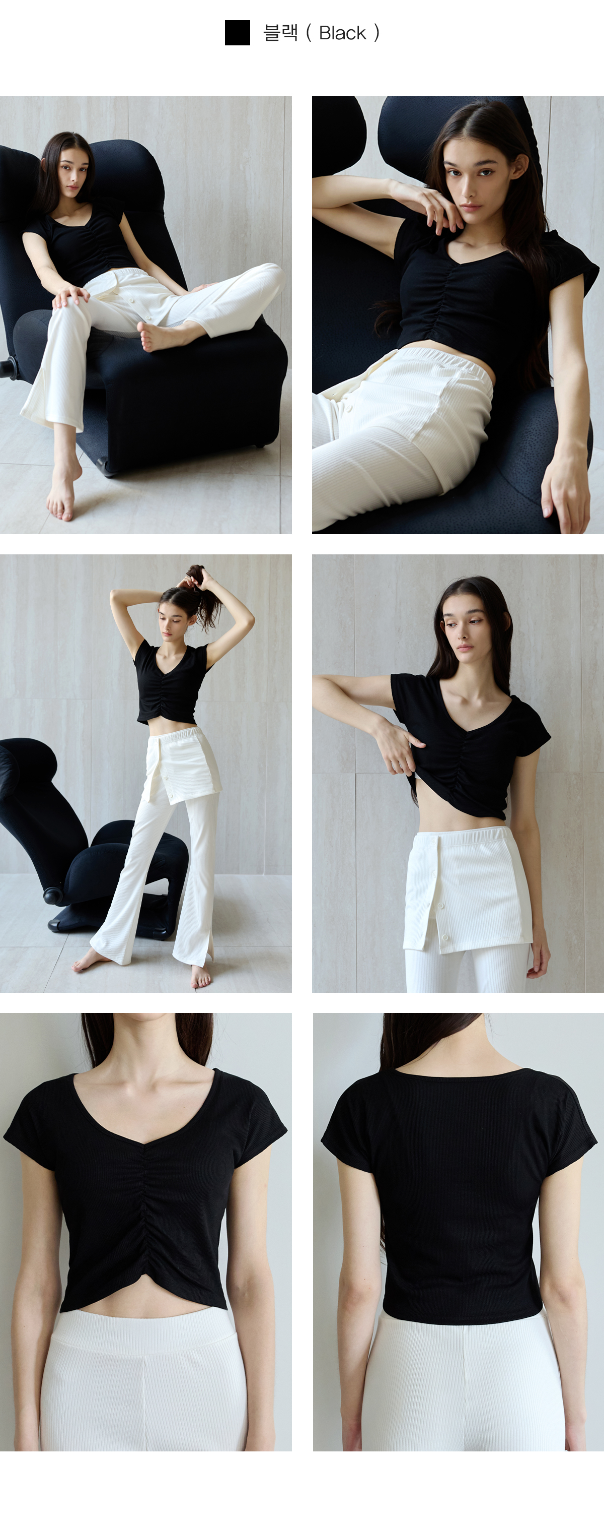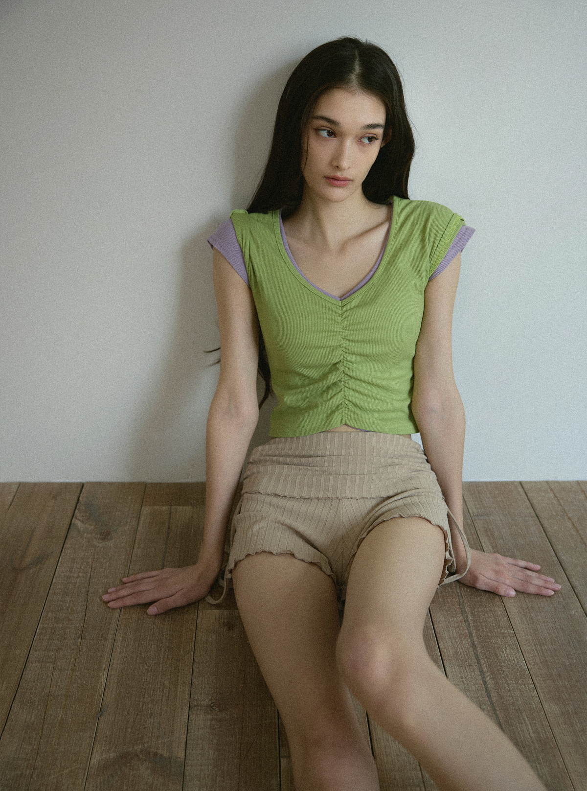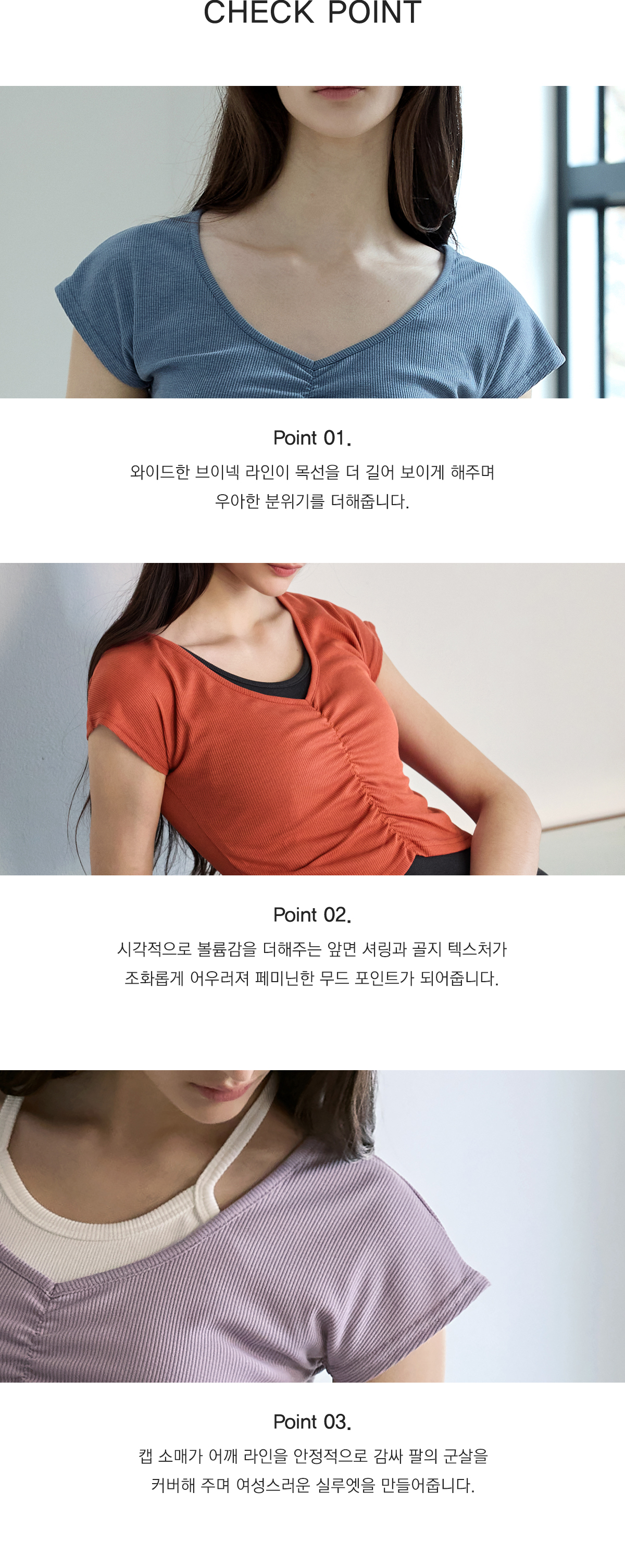 Shirring設計,搭配寬 V 領線條,能有效修飾頸部線條,營造柔美氛圍。 Semi-Crop(半短版) 長度,視覺上能拉長腿部比例。 使用日常感十足的羅紋 (Ribbed) 布料,彈性佳且透氣,無論是運動還是日常穿搭都很合適。